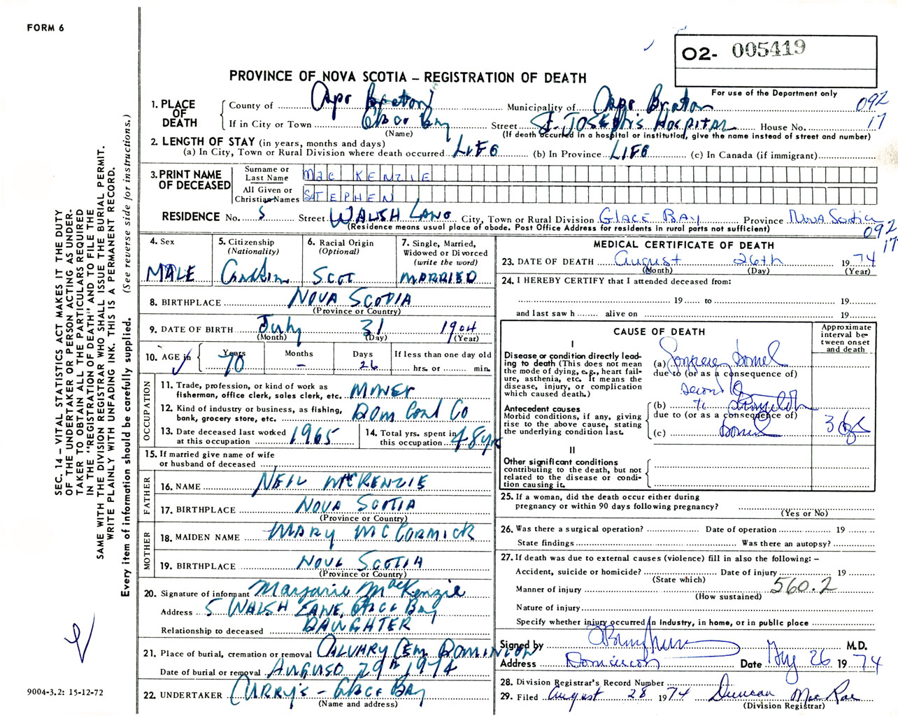 Male Death Registration: Year: 1974 number: 5419