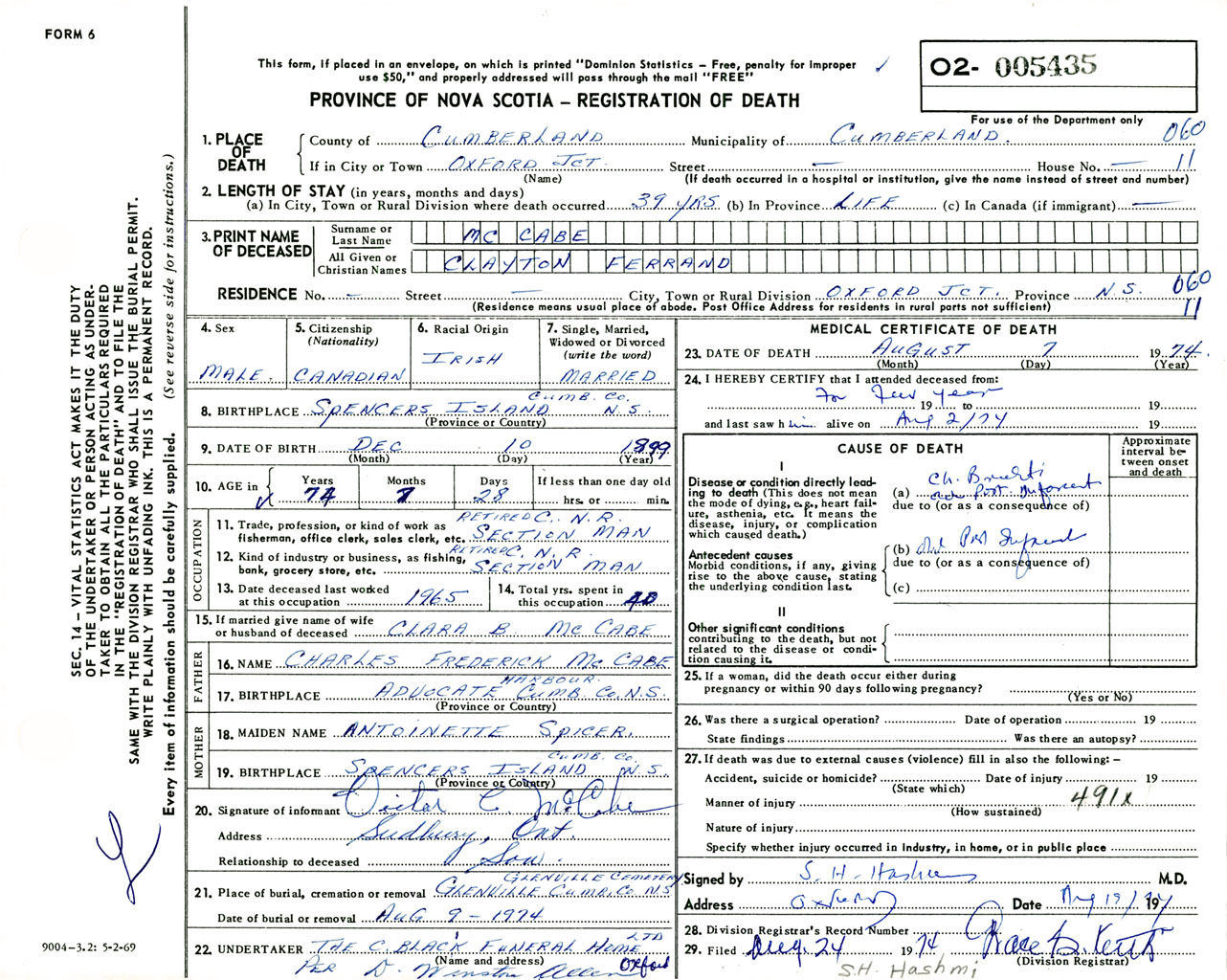 Male Death Registration: Year: 1974 number: 5435