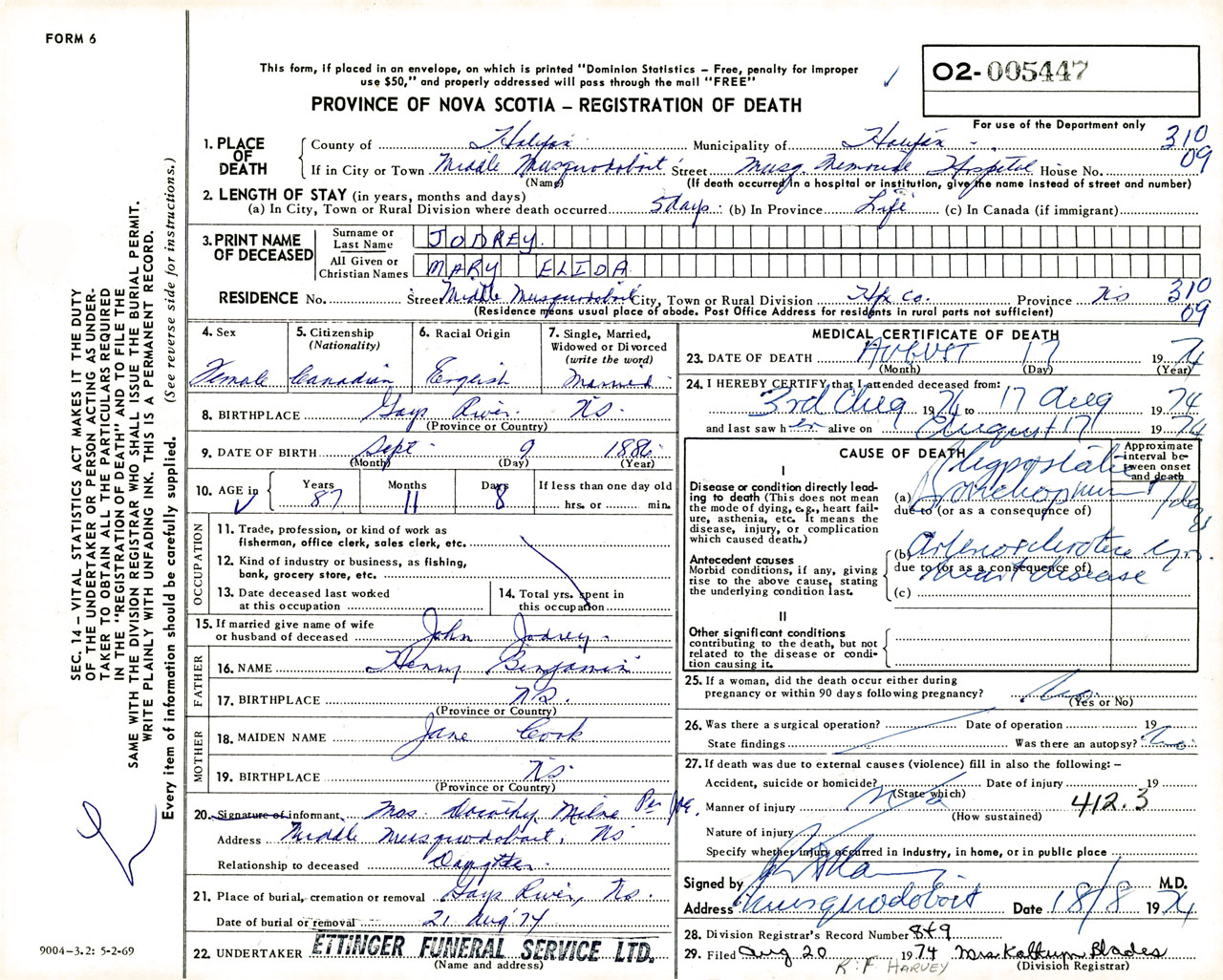 Female Death Registration: Year: 1974 number: 5447