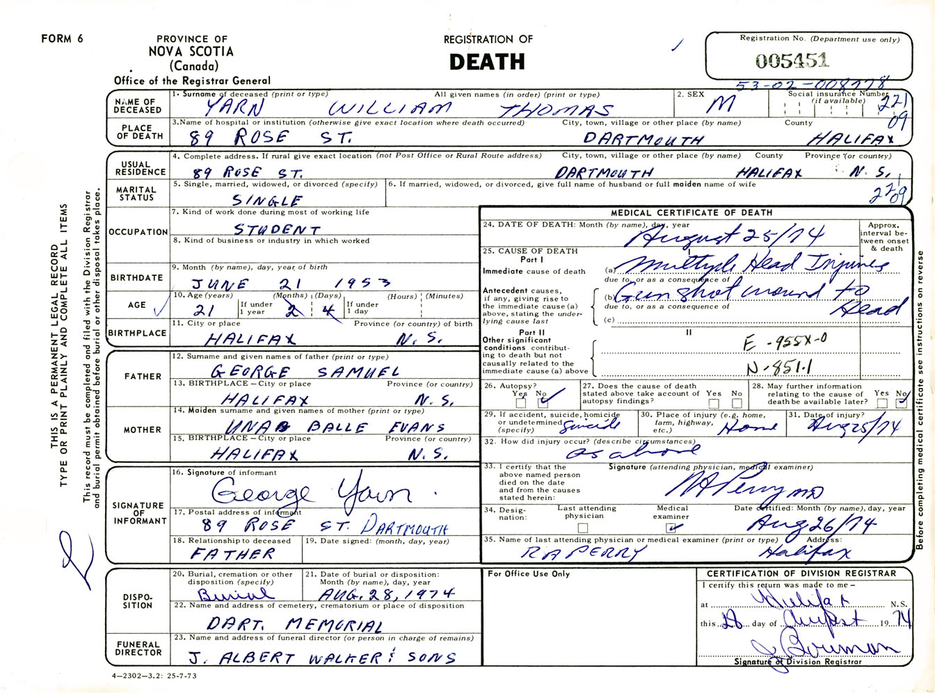 Male Death Registration: Year: 1974 number: 5451