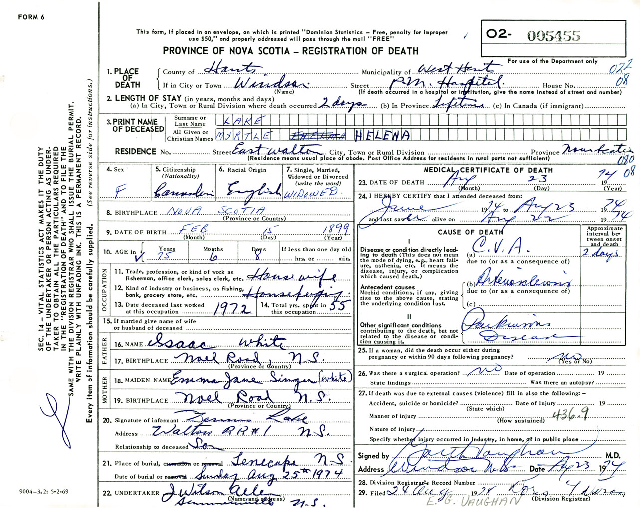 Female Death Registration: Year: 1974 number: 5455