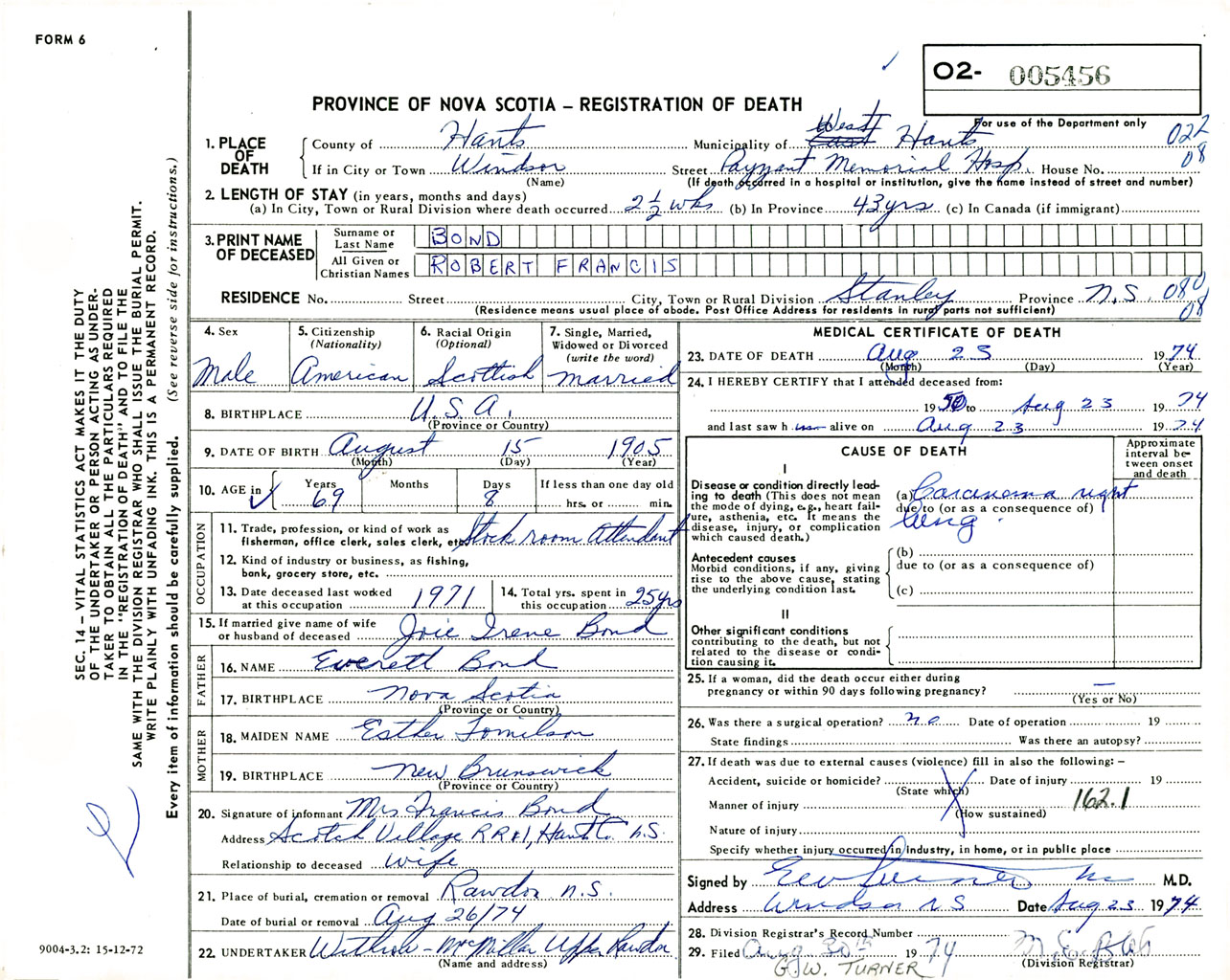 Male Death Registration: Year: 1974 number: 5456