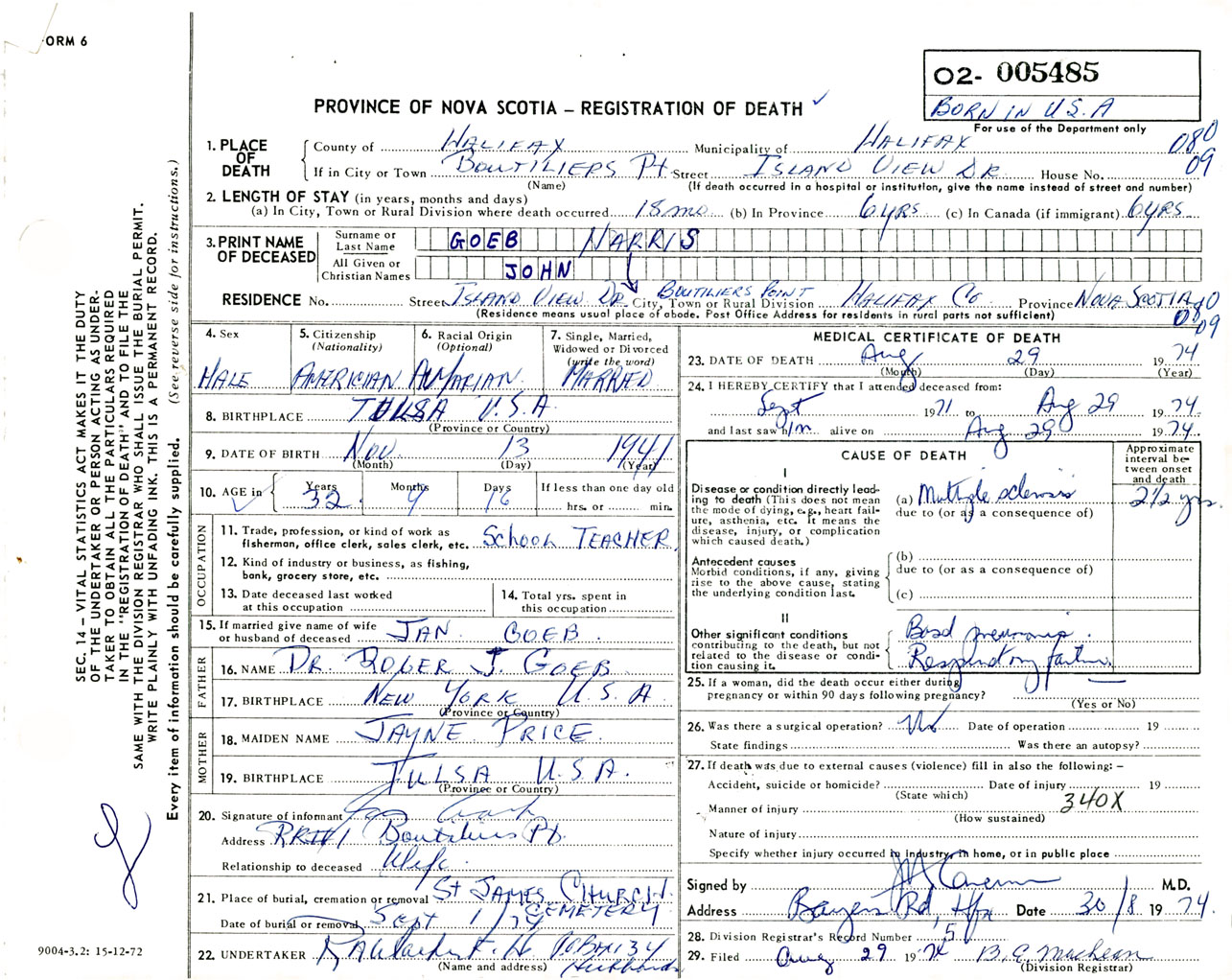 Male Death Registration: Year: 1974 number: 5485