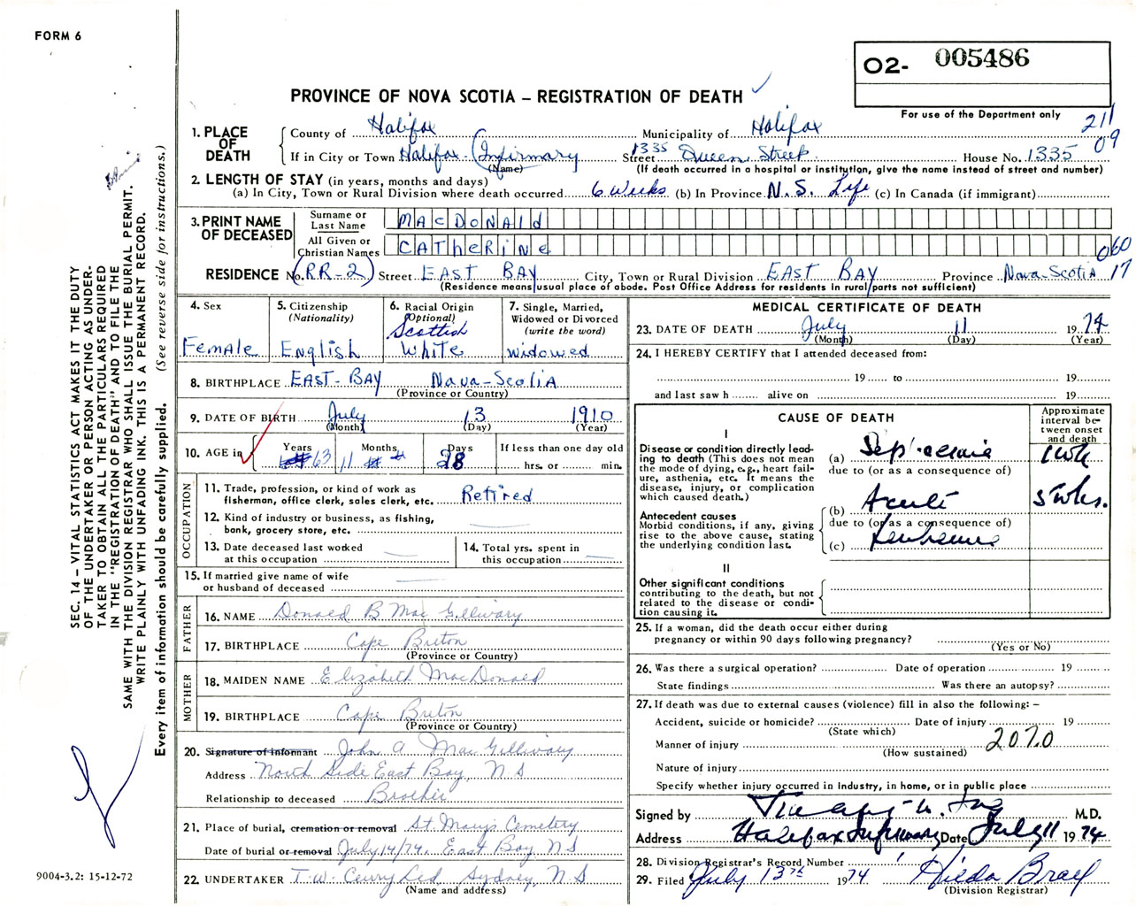 Female Death Registration: Year: 1974 number: 5486