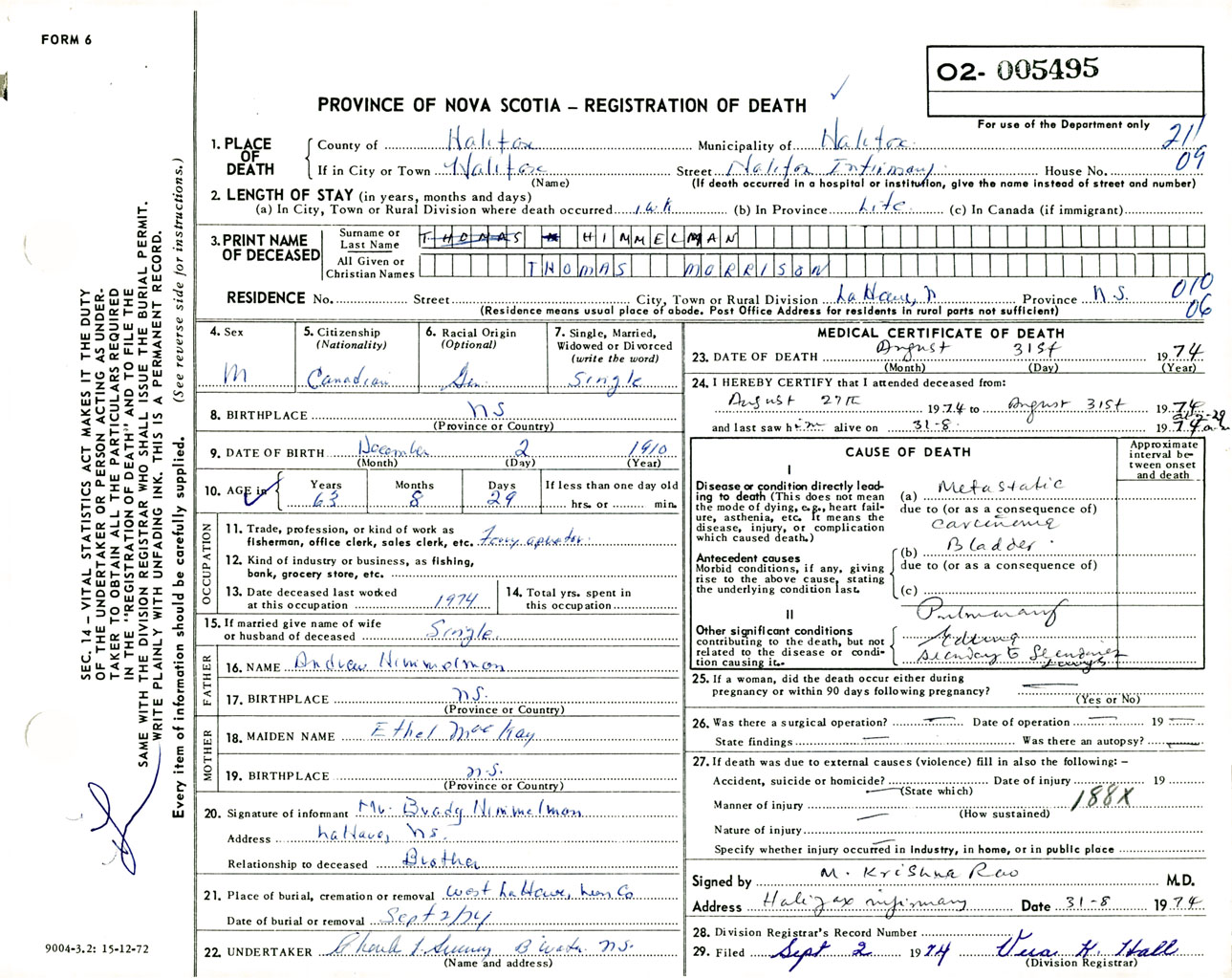 Male Death Registration: Year: 1974 number: 5495