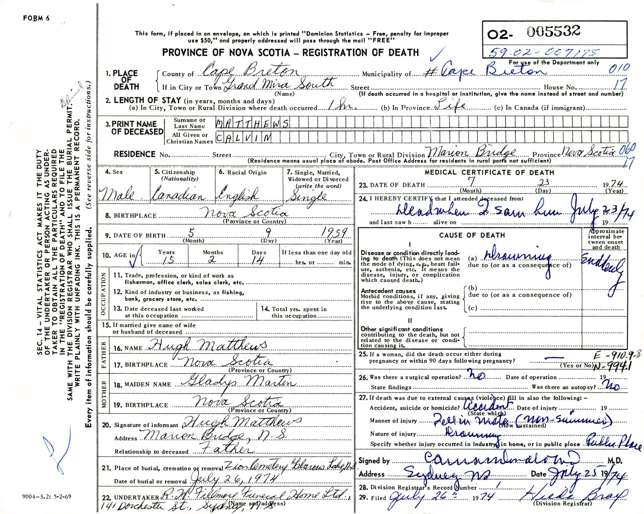 Male Death Registration: Year: 1974 number: 5532