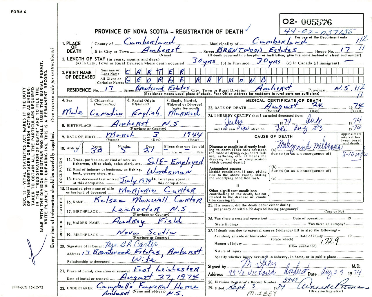 Male Death Registration: Year: 1974 number: 5576