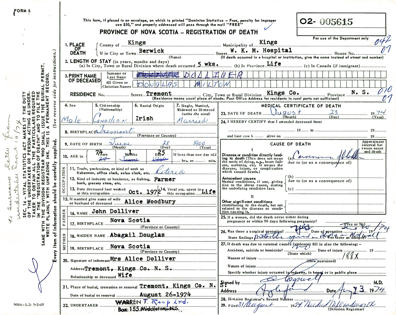 Male Death Registration: Year: 1974 number: 5615
