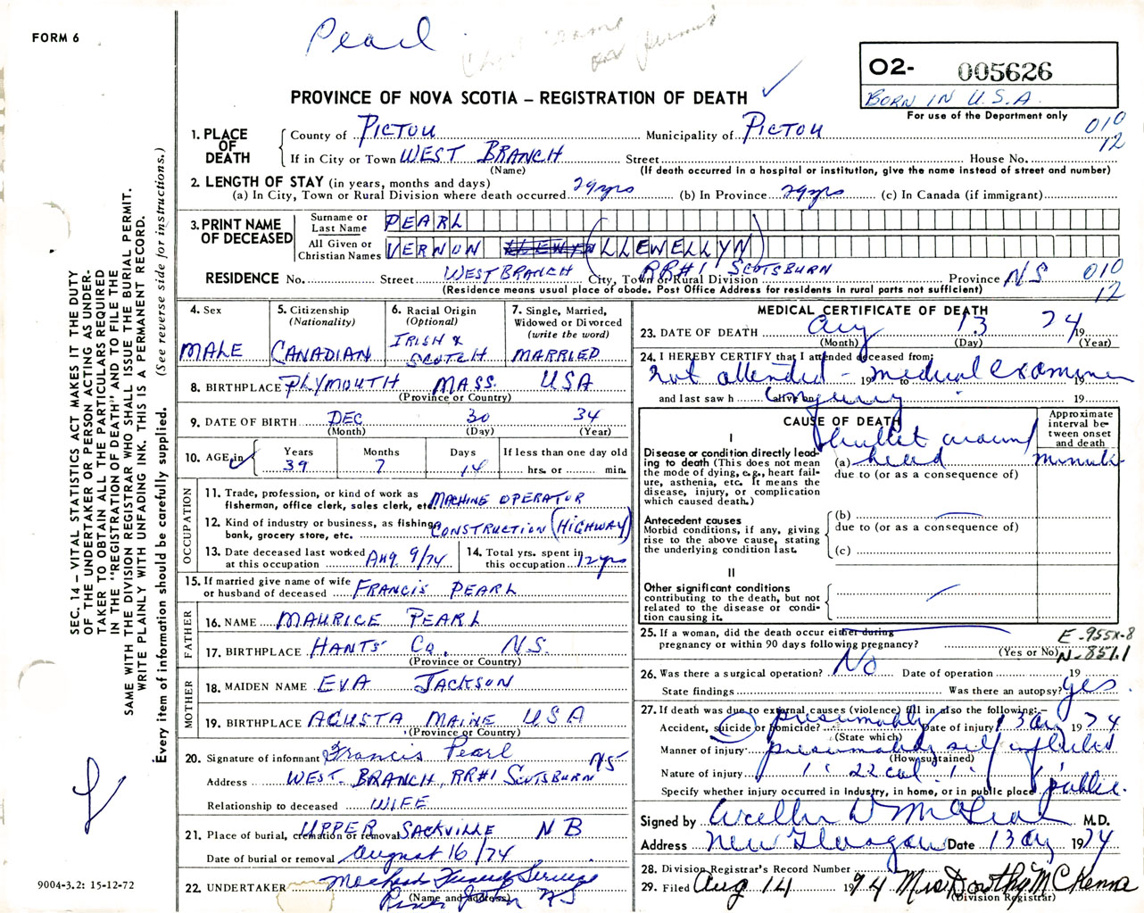 Male Death Registration: Year: 1974 number: 5626