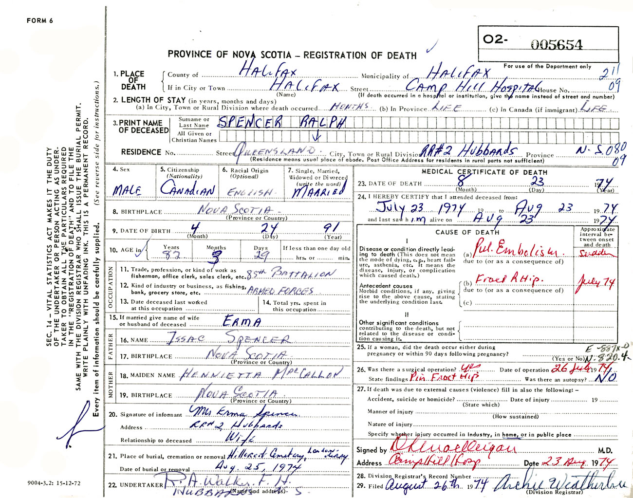 Male Death Registration: Year: 1974 number: 5654