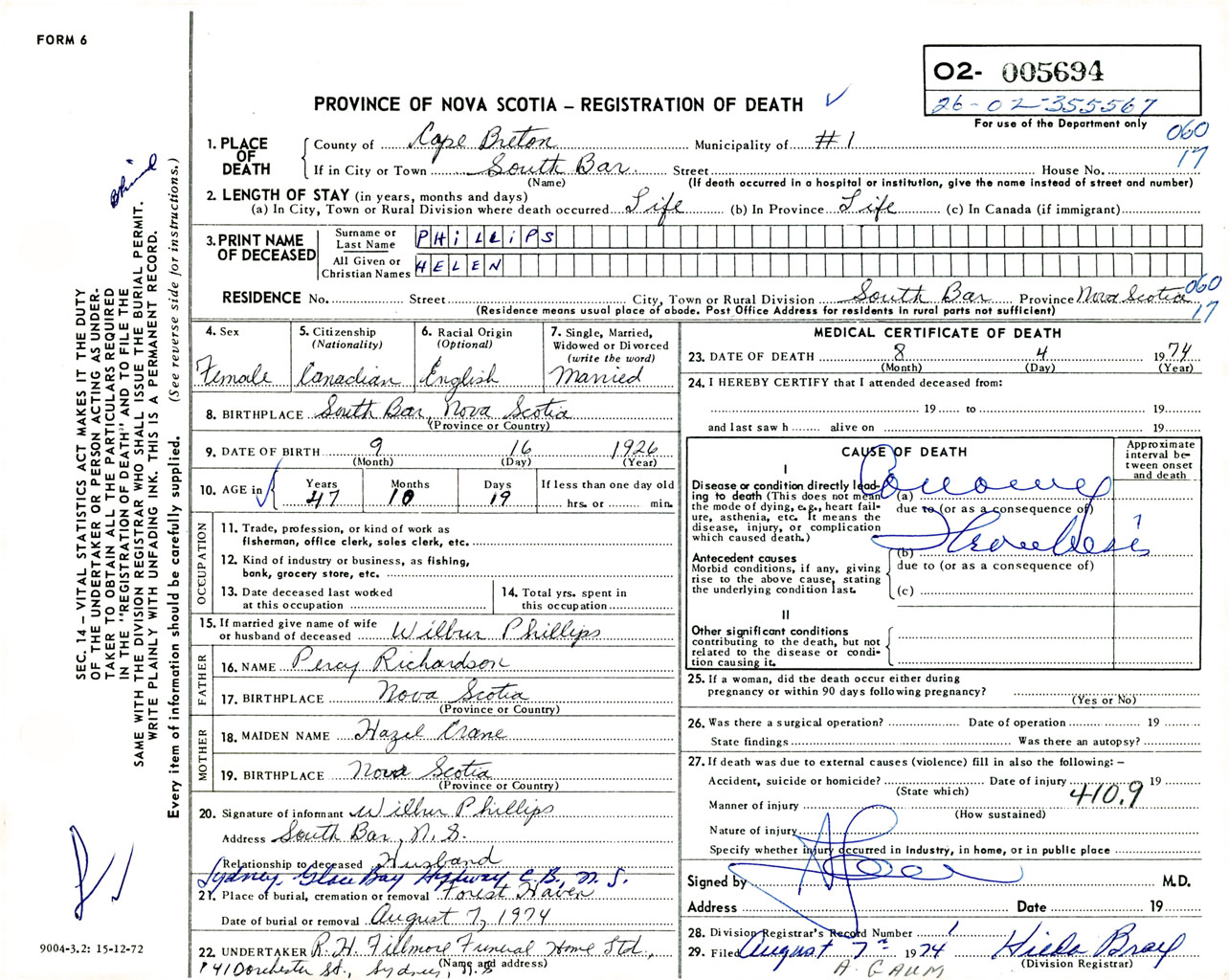 Female Death Registration: Year: 1974 number: 5694