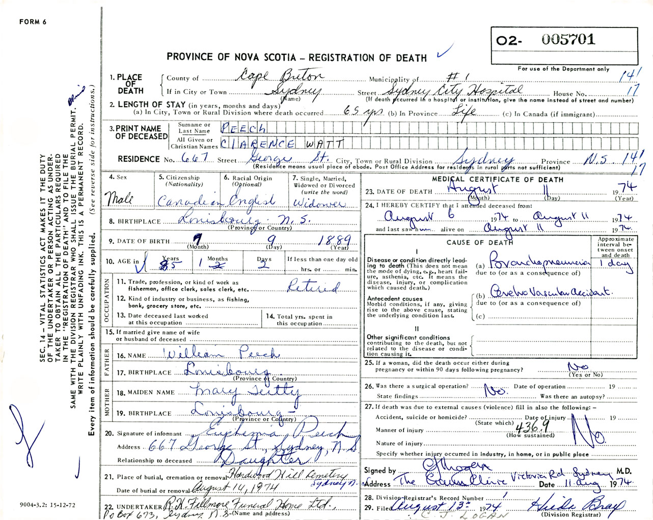 Male Death Registration: Year: 1974 number: 5701