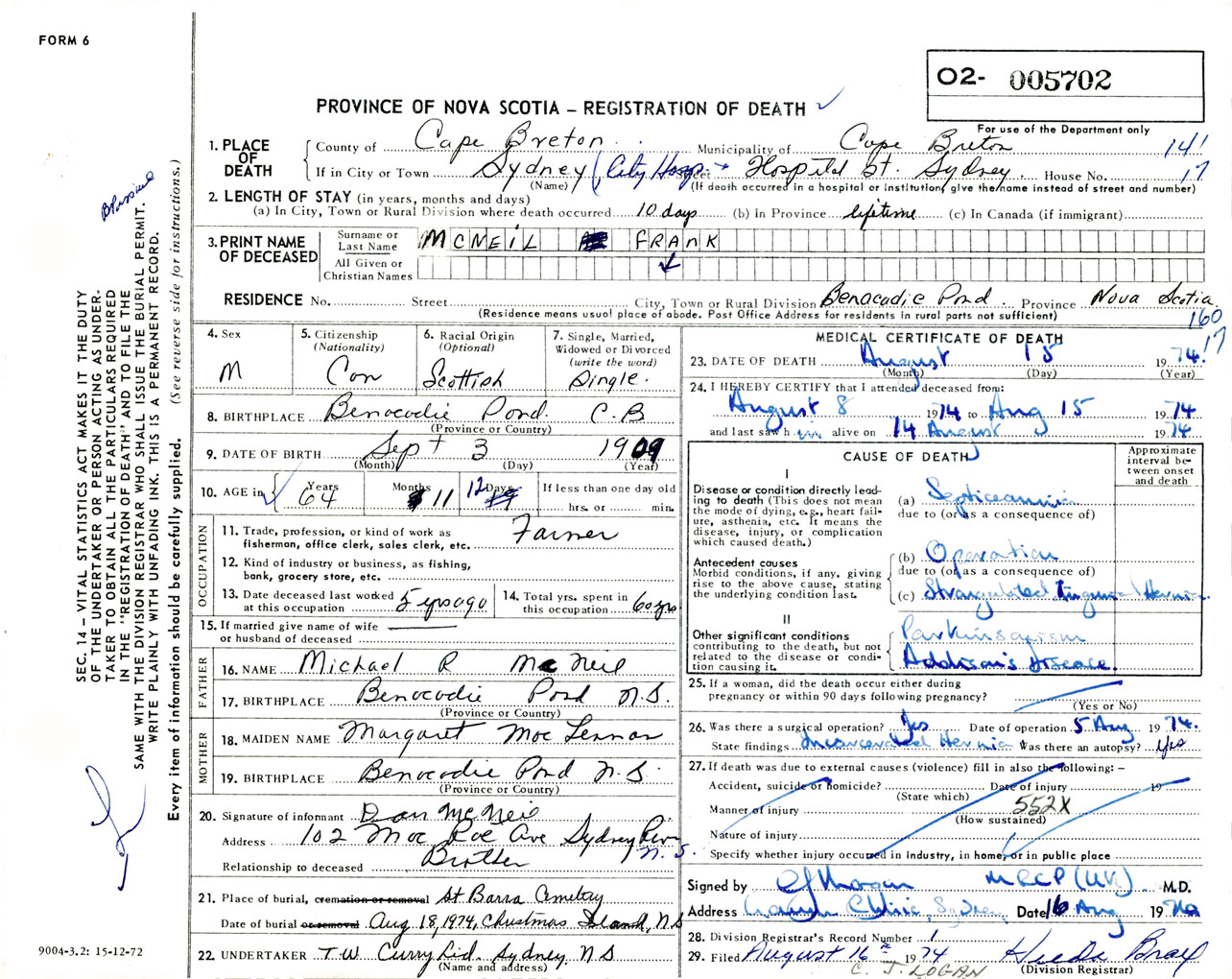 Male Death Registration: Year: 1974 number: 5702