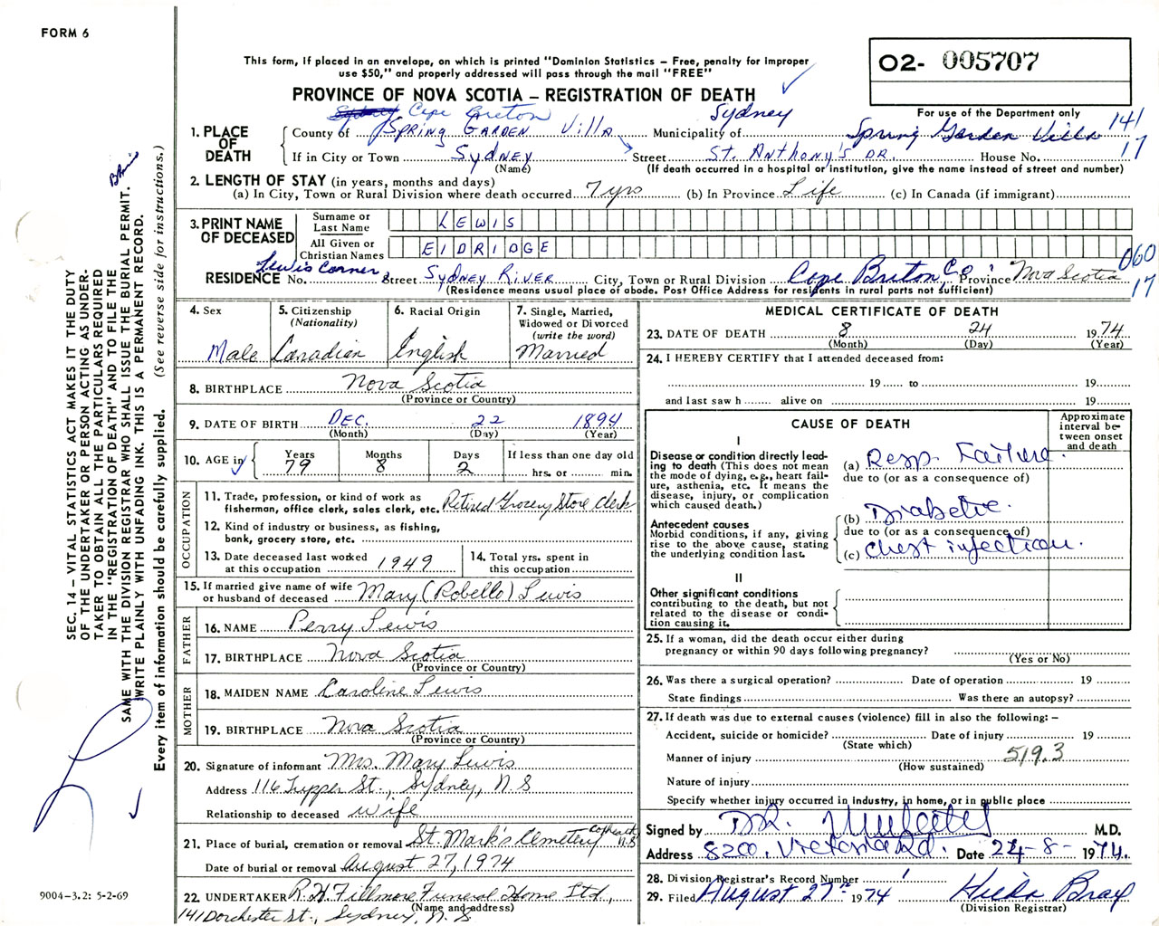 Male Death Registration: Year: 1974 number: 5707