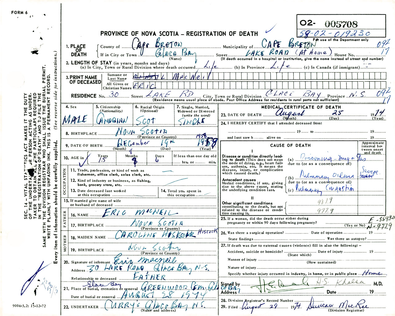 Male Death Registration: Year: 1974 number: 5708