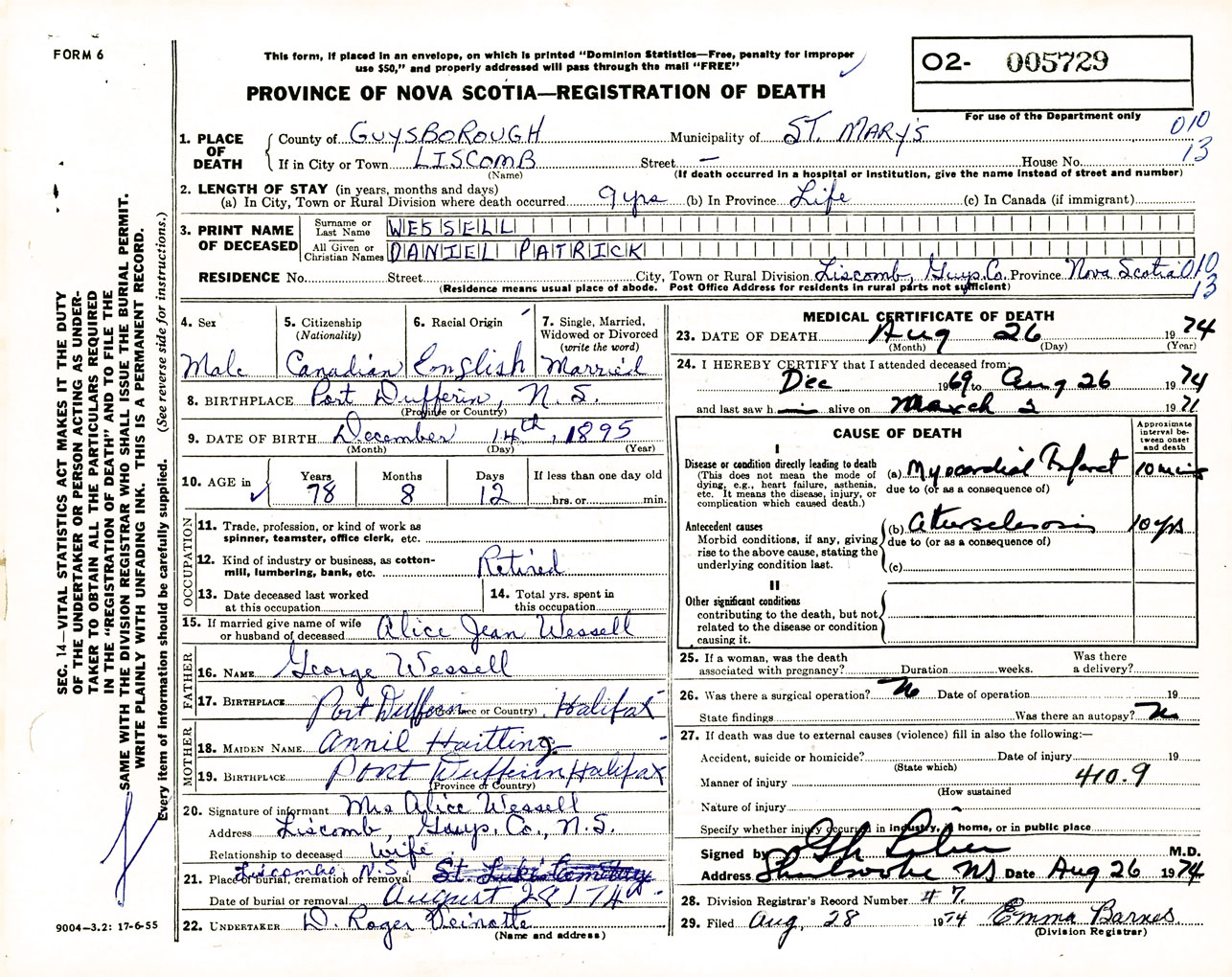 Male Death Registration: Year: 1974 number: 5729