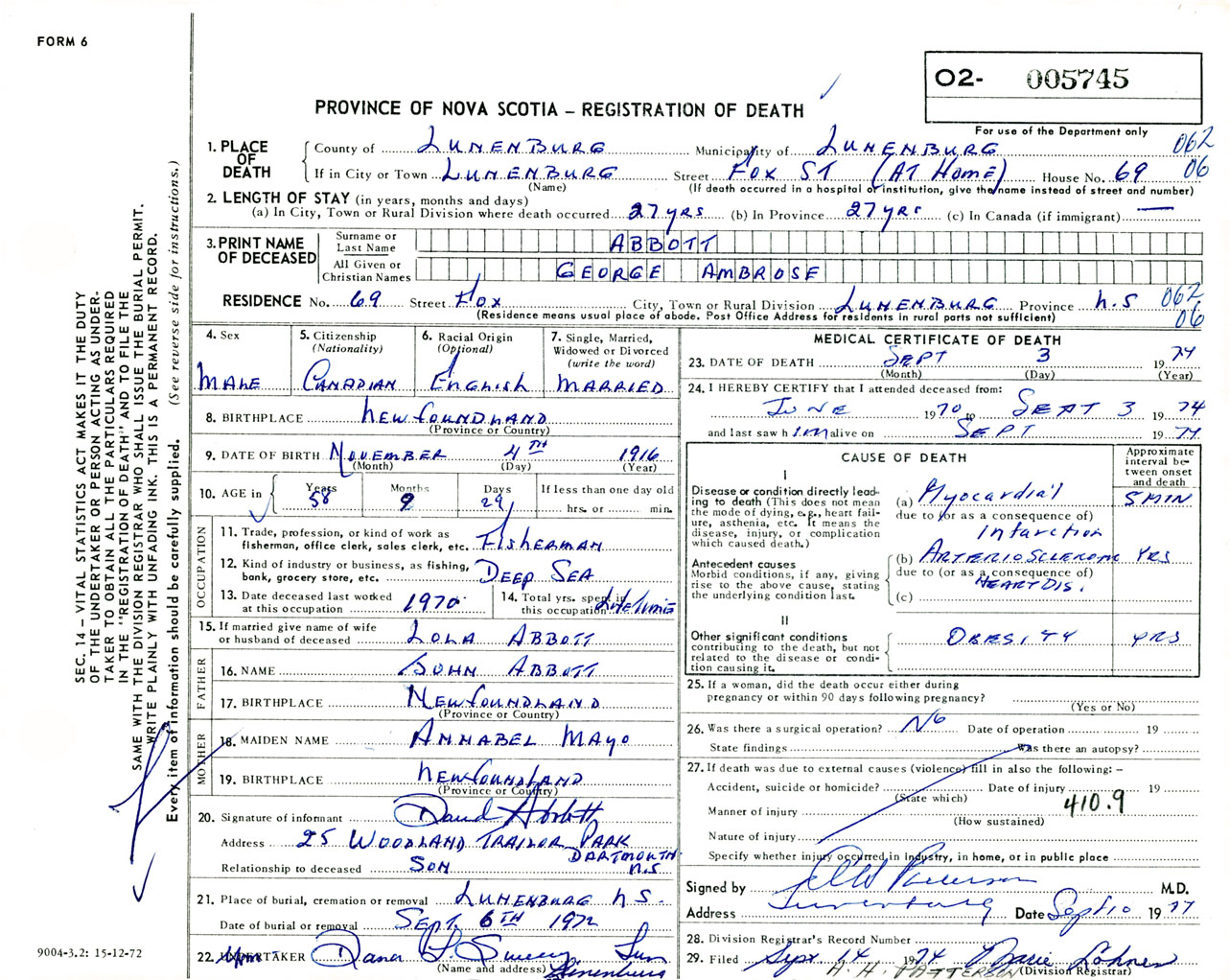Male Death Registration: Year: 1974 number: 5745