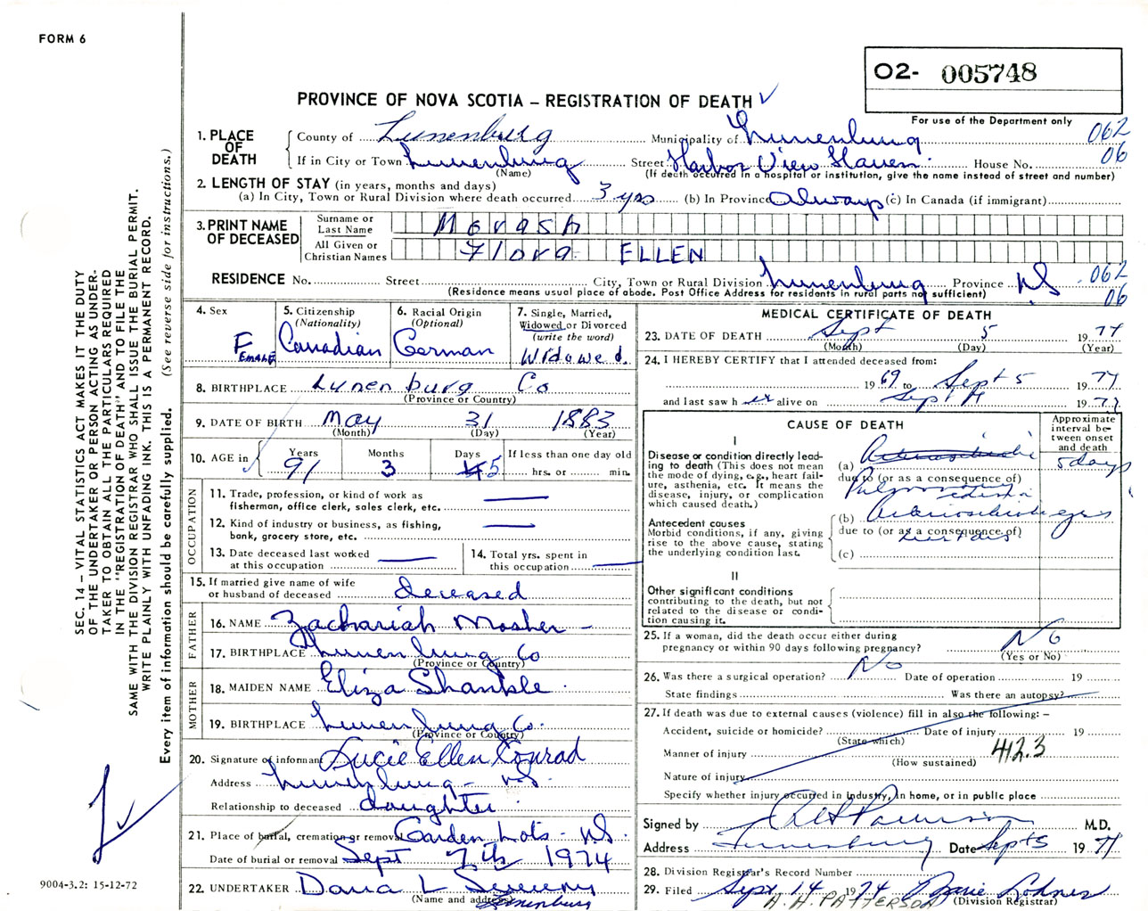 Female Death Registration: Year: 1974 number: 5748