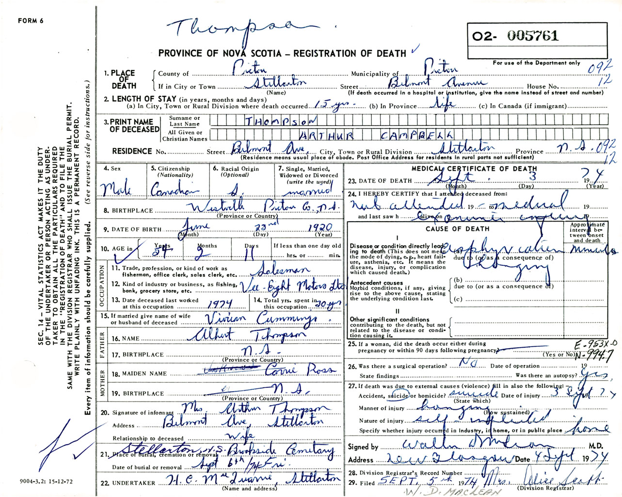 Male Death Registration: Year: 1974 number: 5761