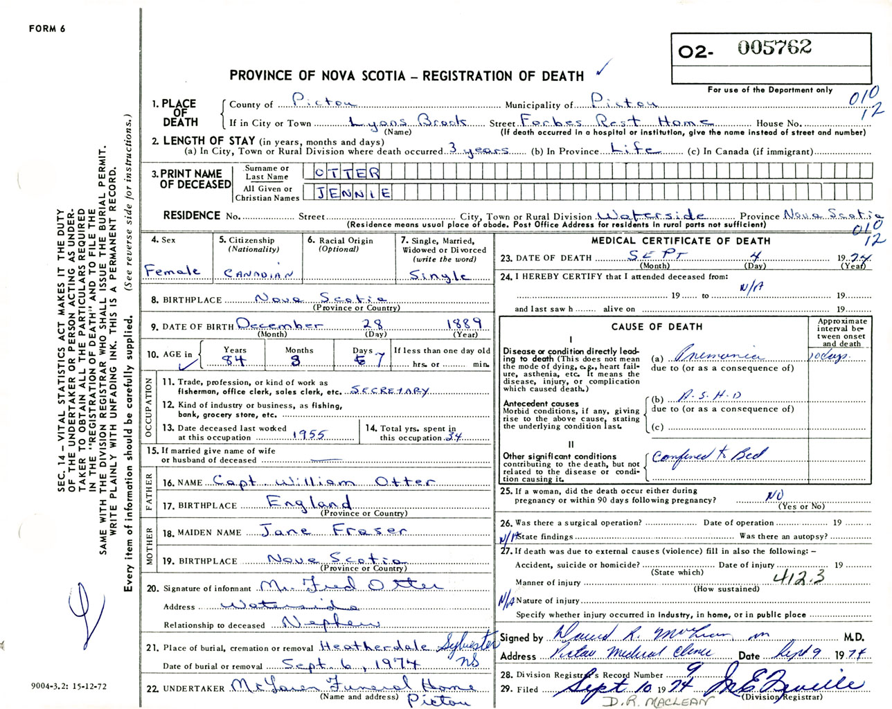 Female Death Registration: Year: 1974 number: 5762