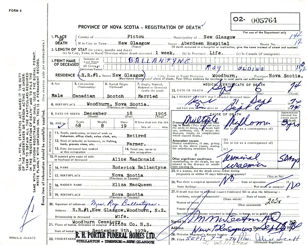 Male Death Registration: Year: 1974 number: 5764