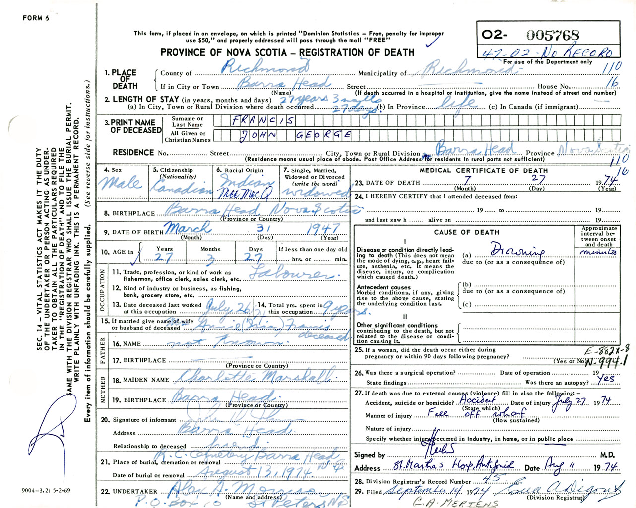 Male Death Registration: Year: 1974 number: 5768