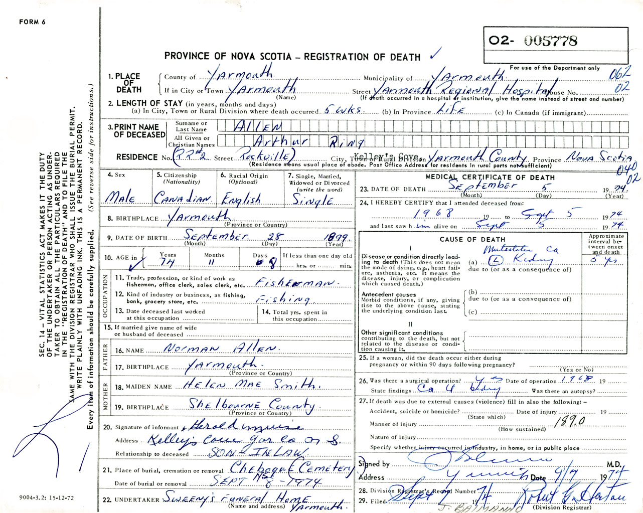 Male Death Registration: Year: 1974 number: 5778