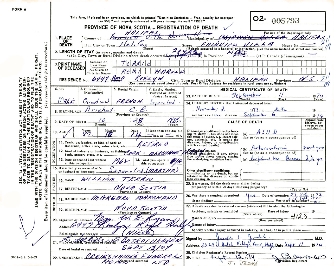 Male Death Registration: Year: 1974 number: 5793