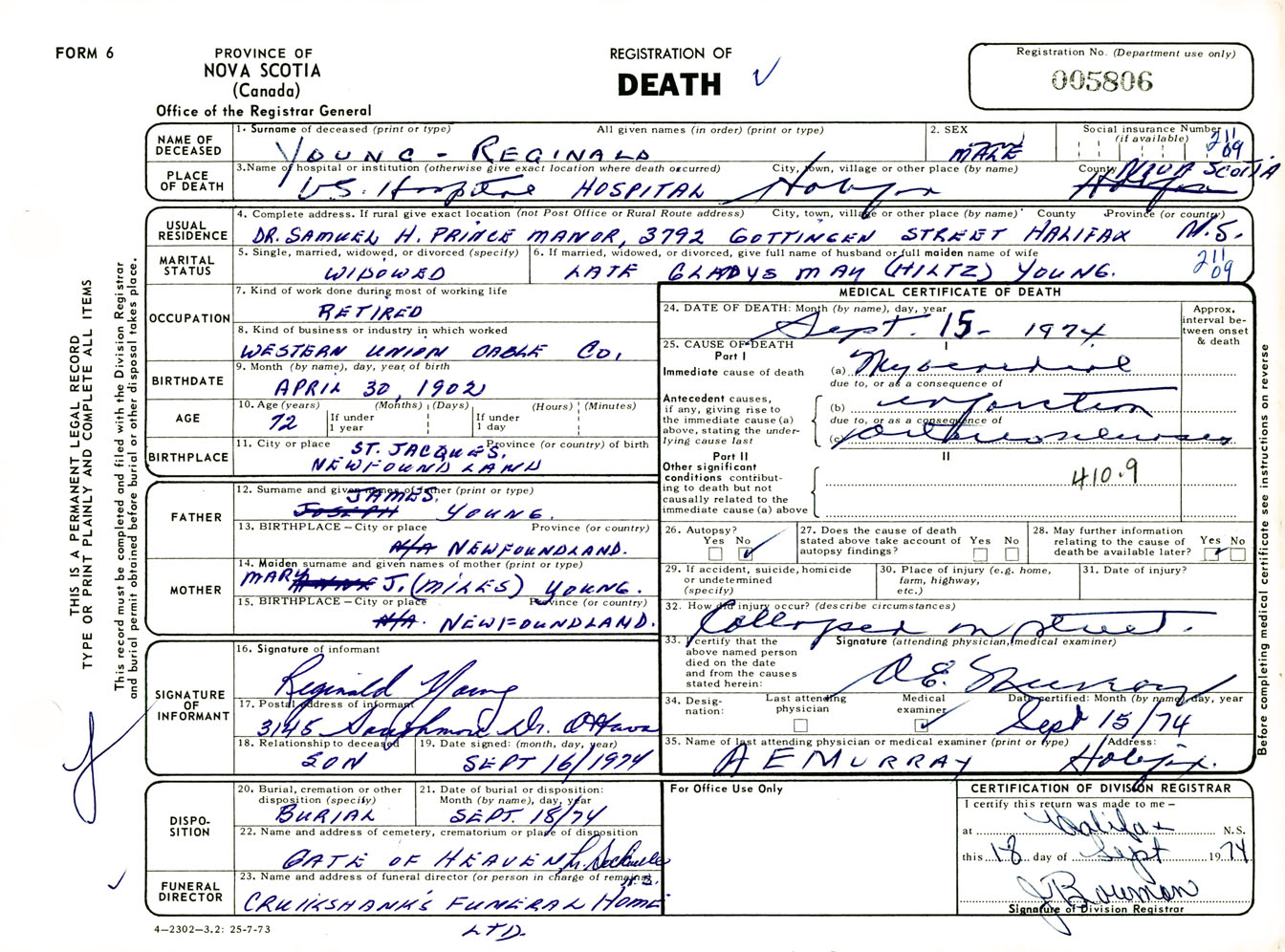 Male Death Registration: Year: 1974 number: 5806