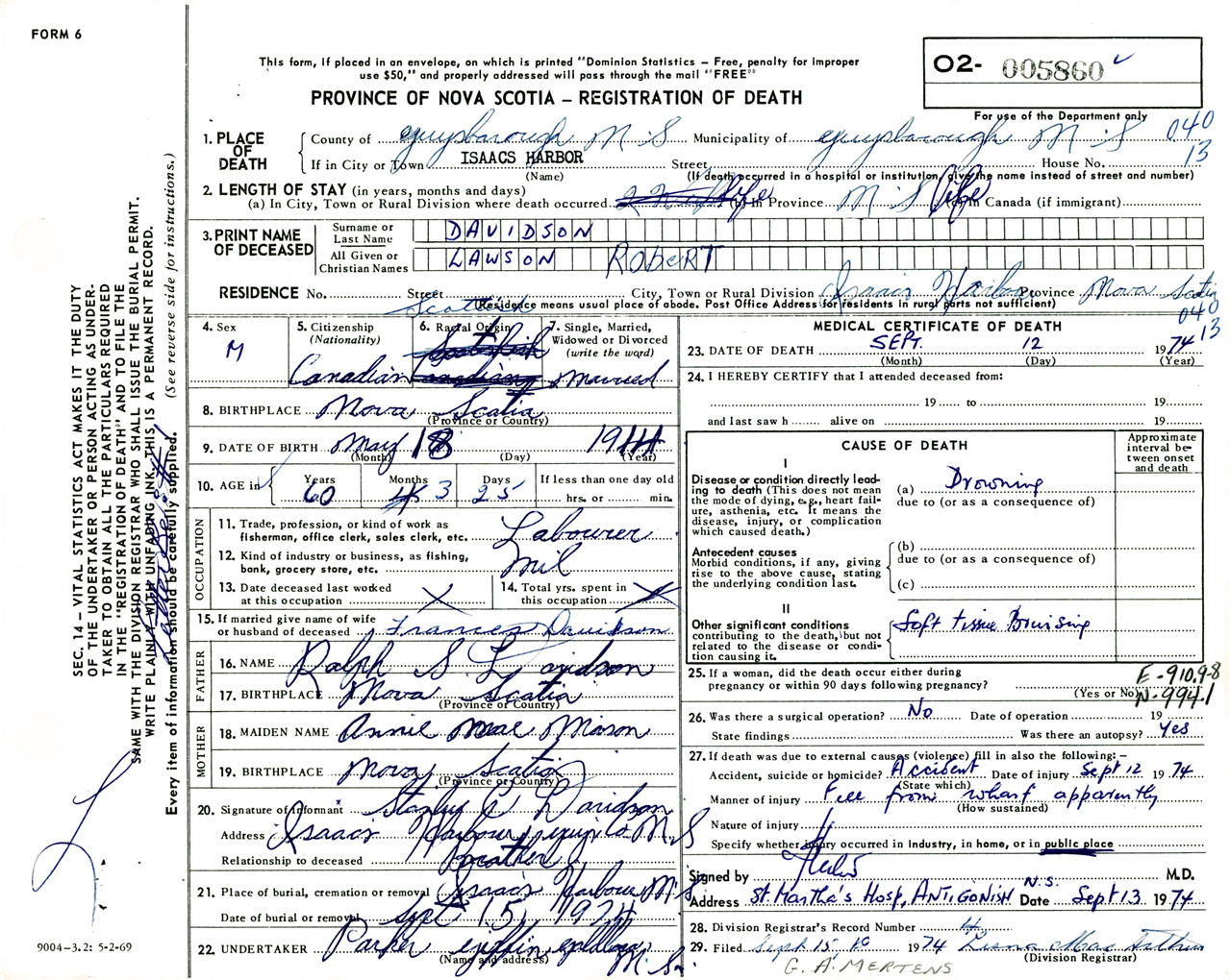 Male Death Registration: Year: 1974 number: 5860