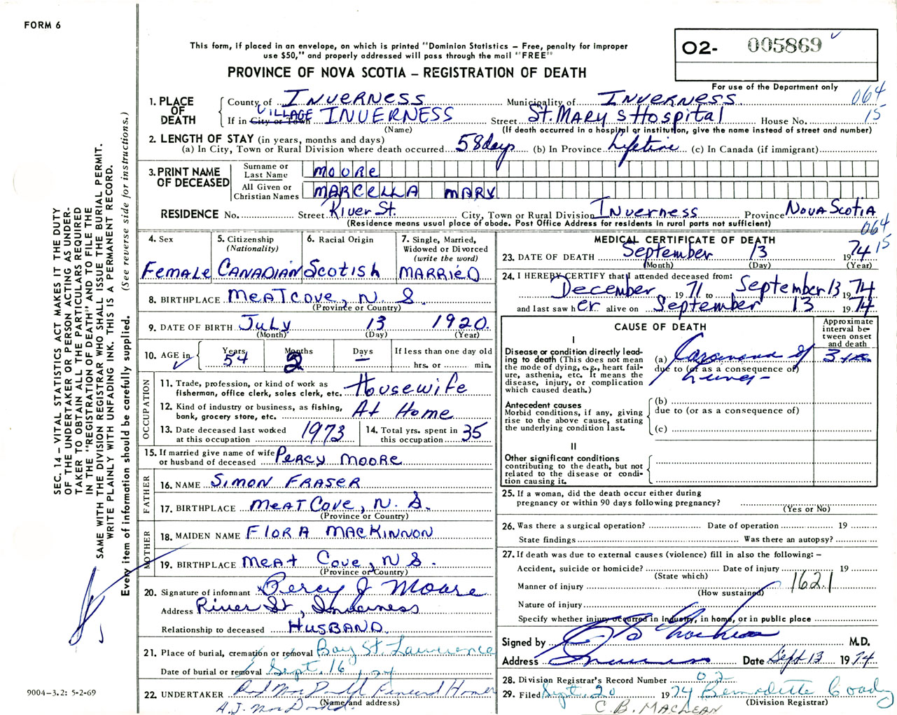 Female Death Registration: Year: 1974 number: 5869