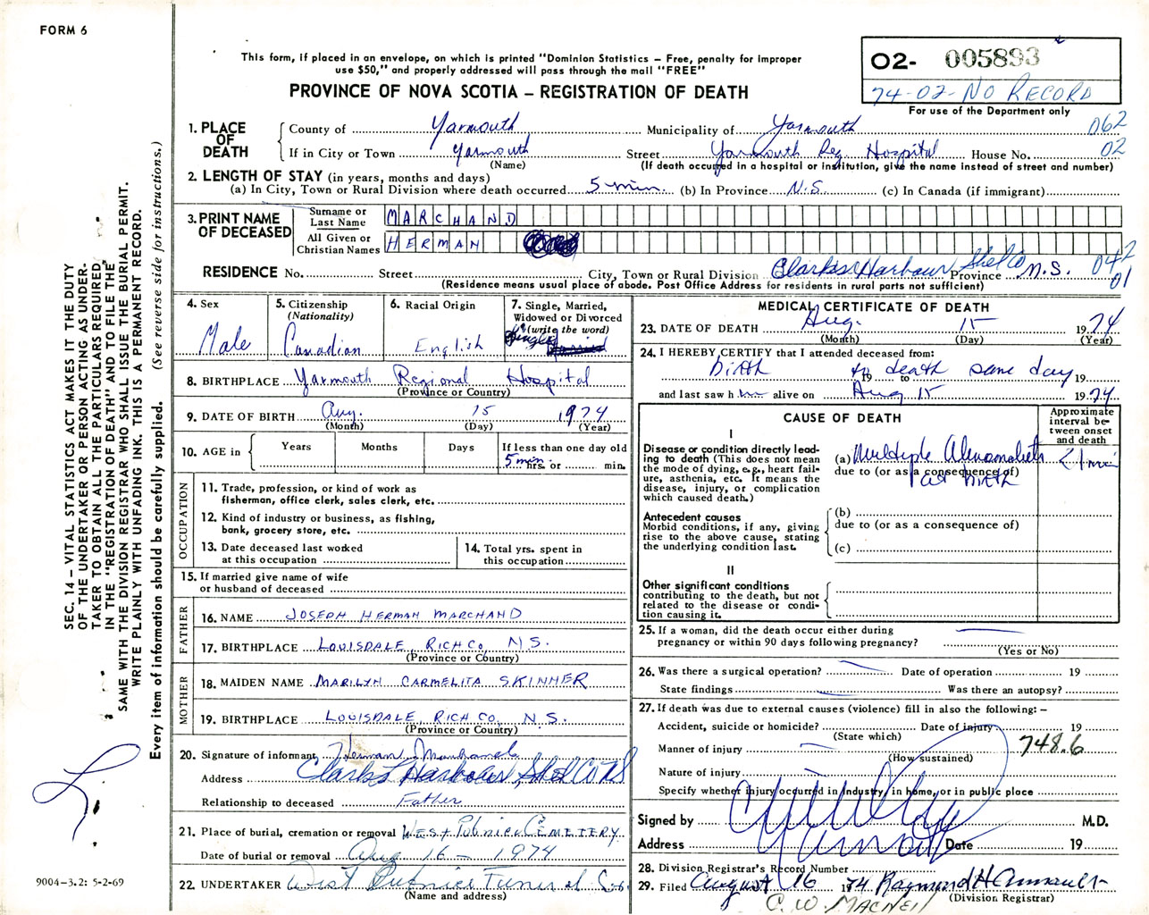 Male Death Registration: Year: 1974 number: 5893