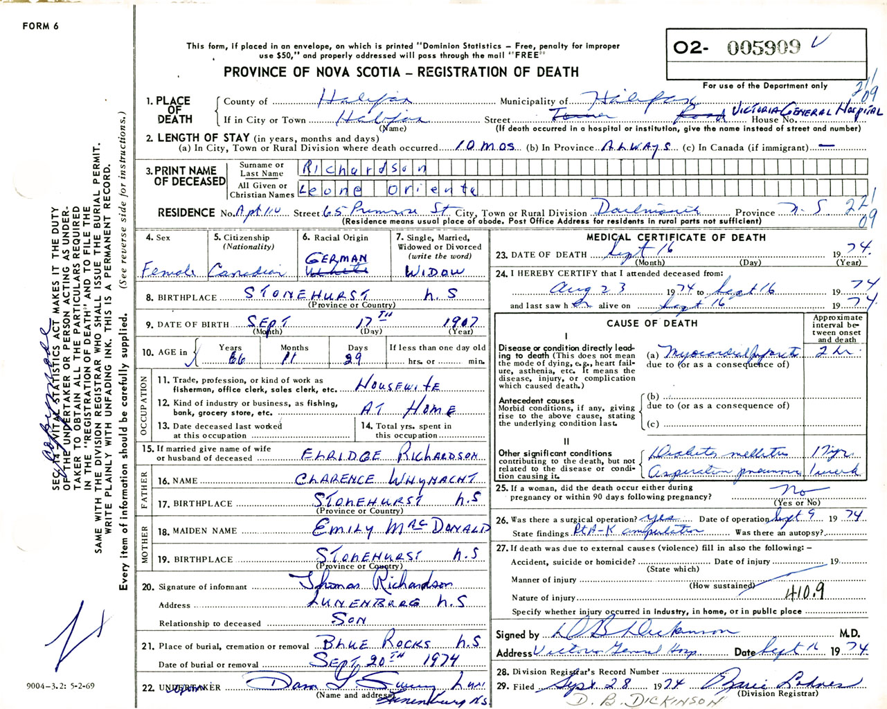 Female Death Registration: Year: 1974 number: 5909
