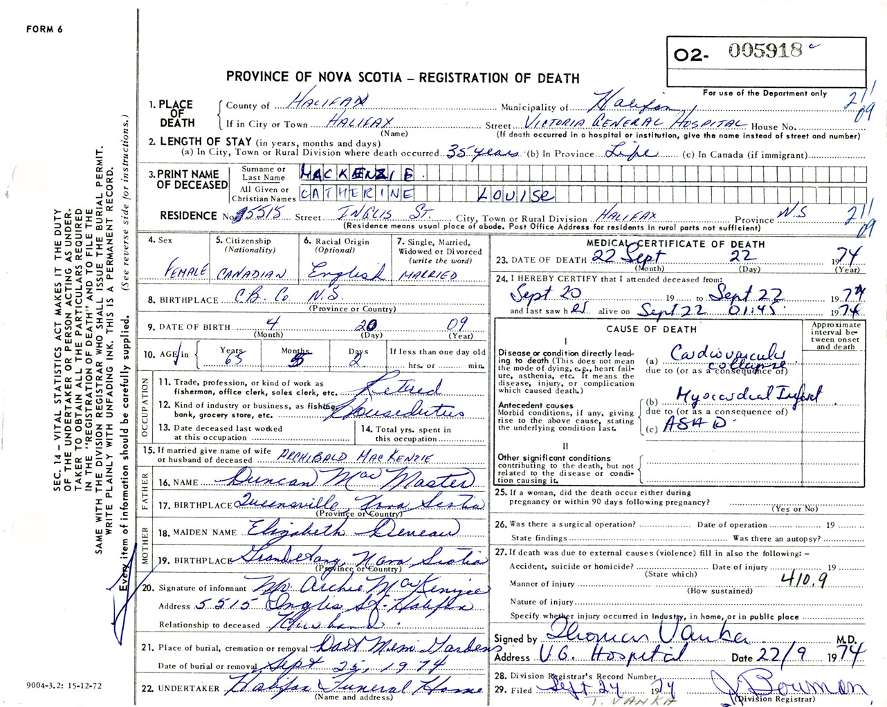 Female Death Registration: Year: 1974 number: 5918