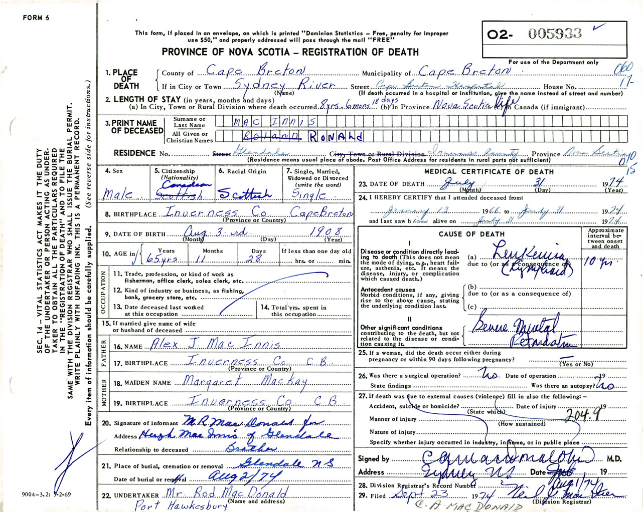 Male Death Registration: Year: 1974 number: 5933