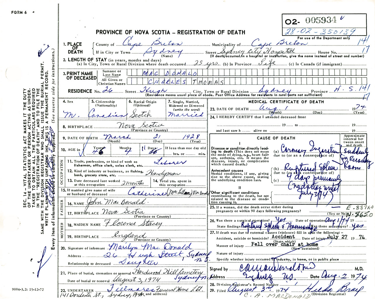 Male Death Registration: Year: 1974 number: 5934