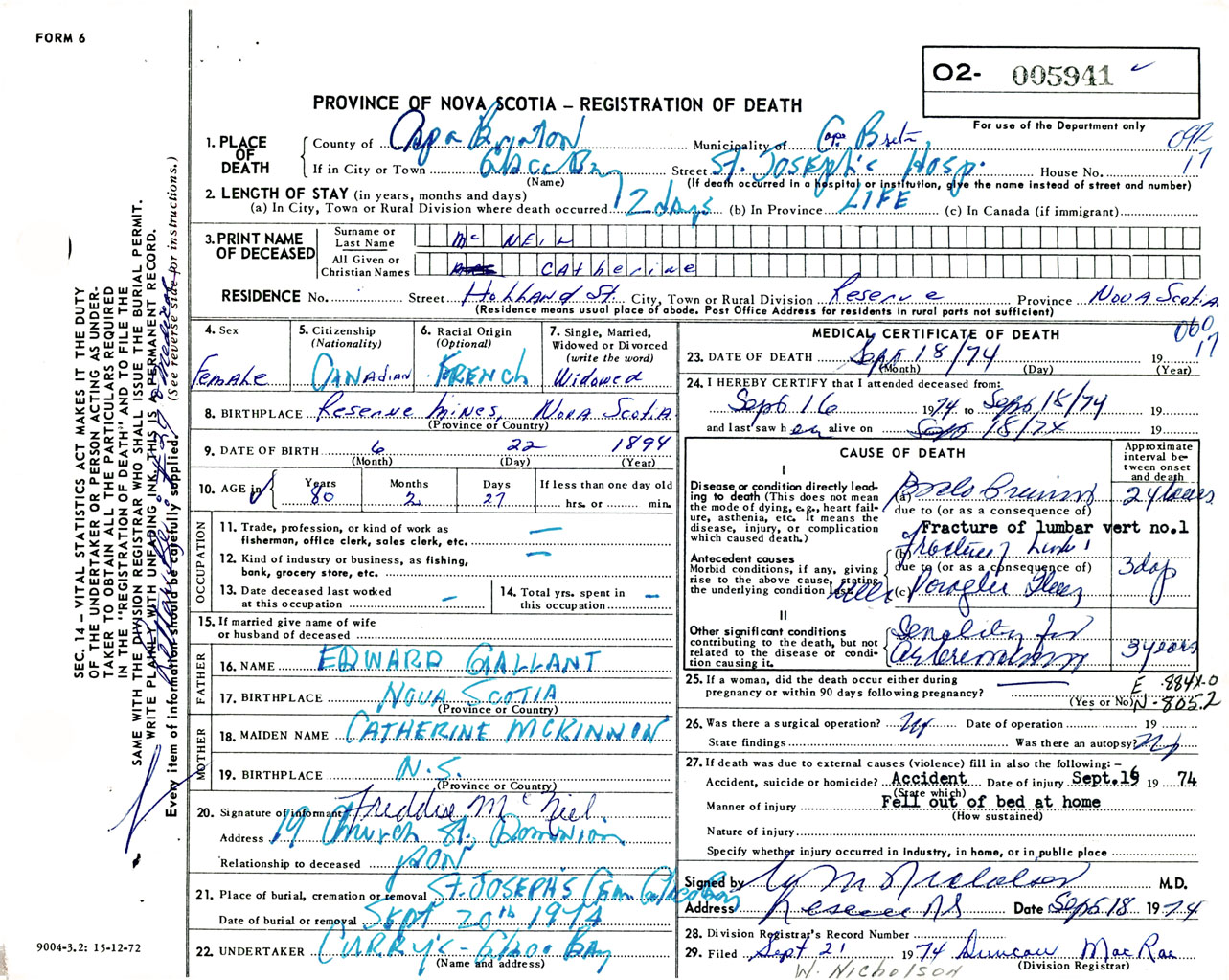 Female Death Registration: Year: 1974 number: 5941