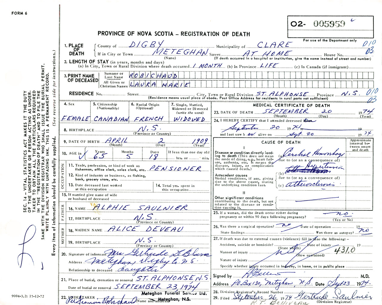 Female Death Registration: Year: 1974 number: 5959