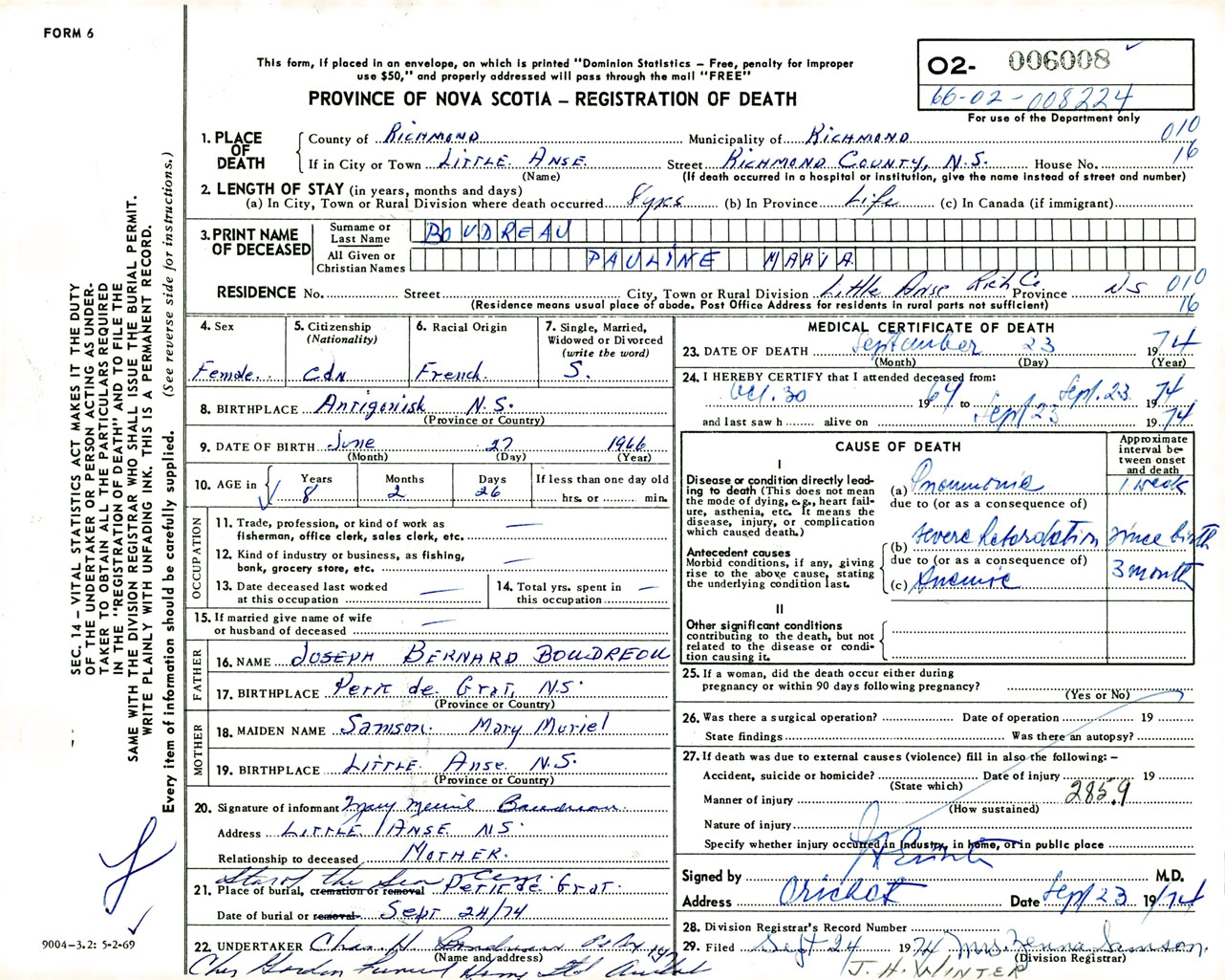 Female Death Registration: Year: 1974 number: 6008