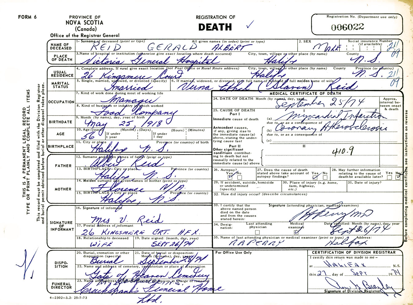 Male Death Registration: Year: 1974 number: 6022