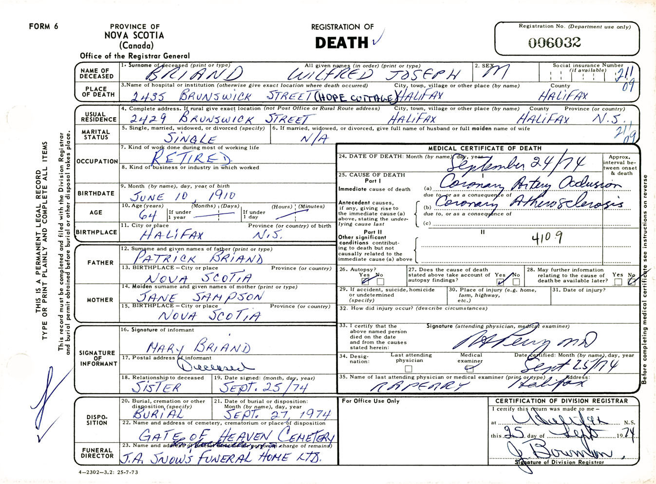 Male Death Registration: Year: 1974 number: 6032