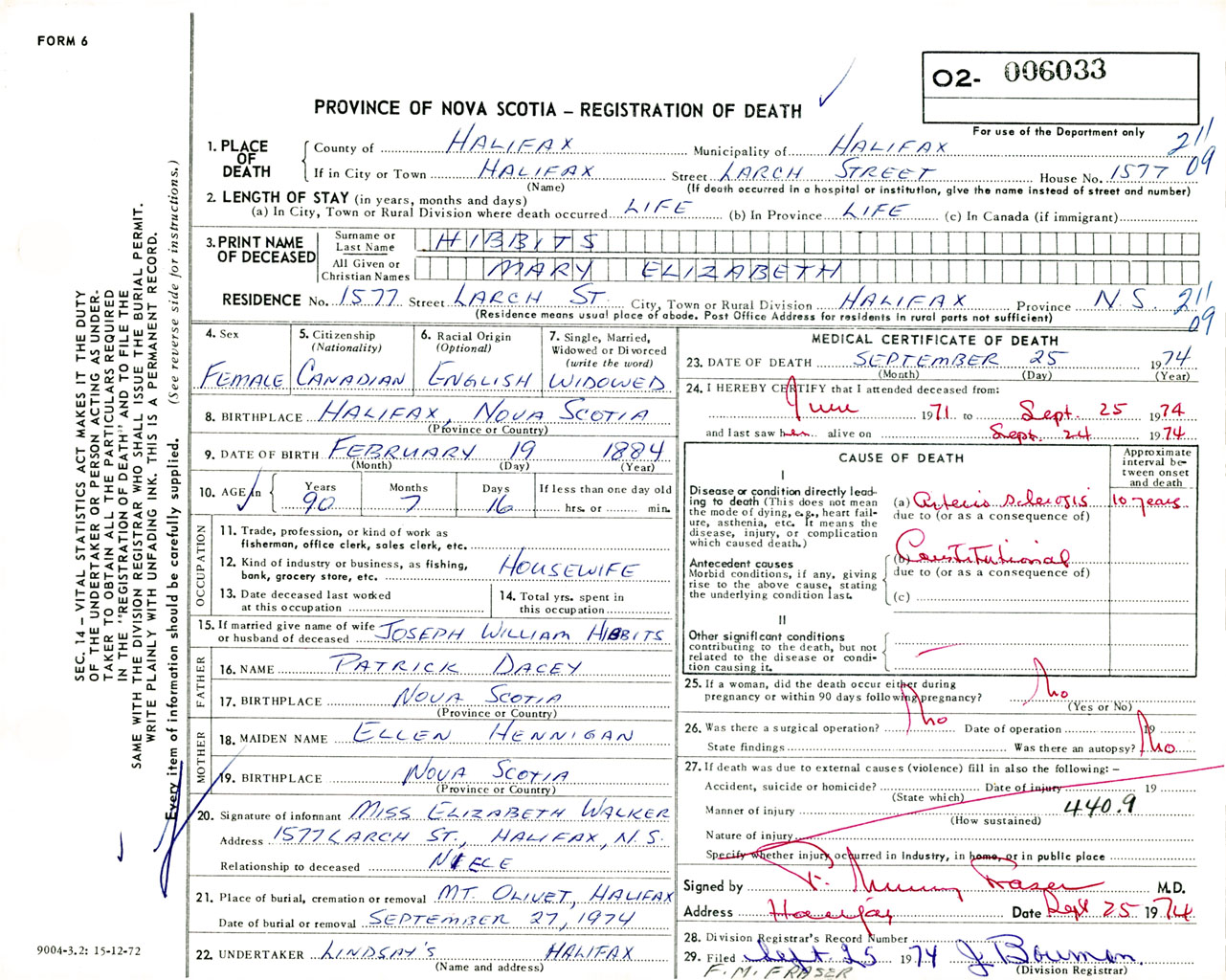 Female Death Registration: Year: 1974 number: 6033