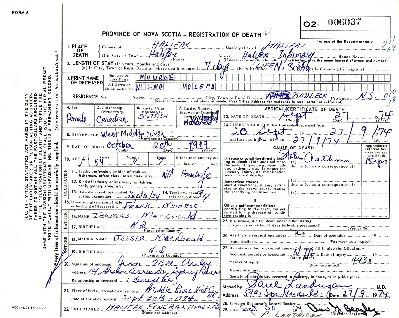 Female Death Registration: Year: 1974 number: 6037