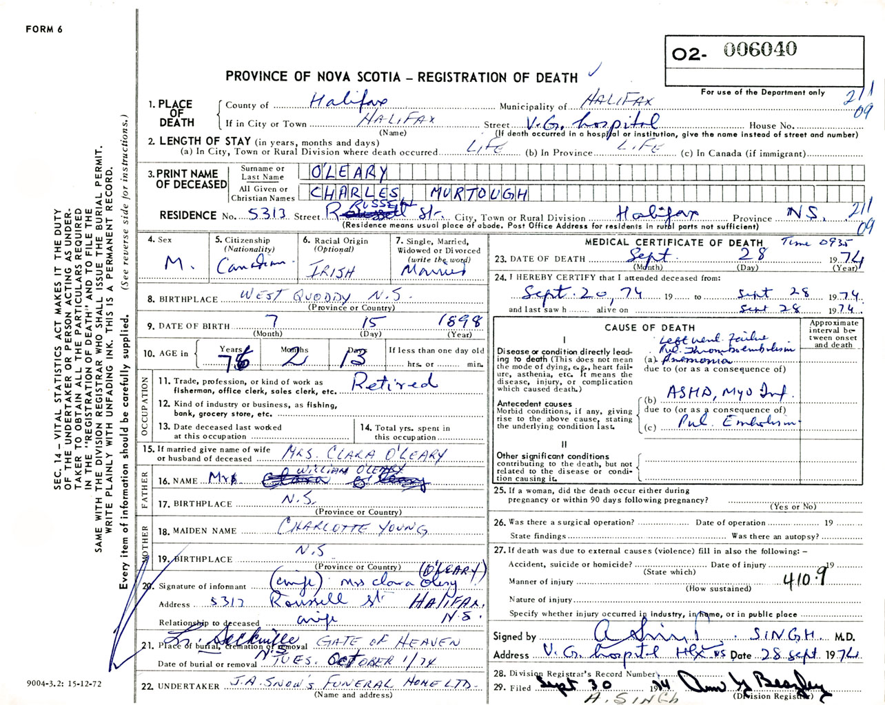 Male Death Registration: Year: 1974 number: 6040