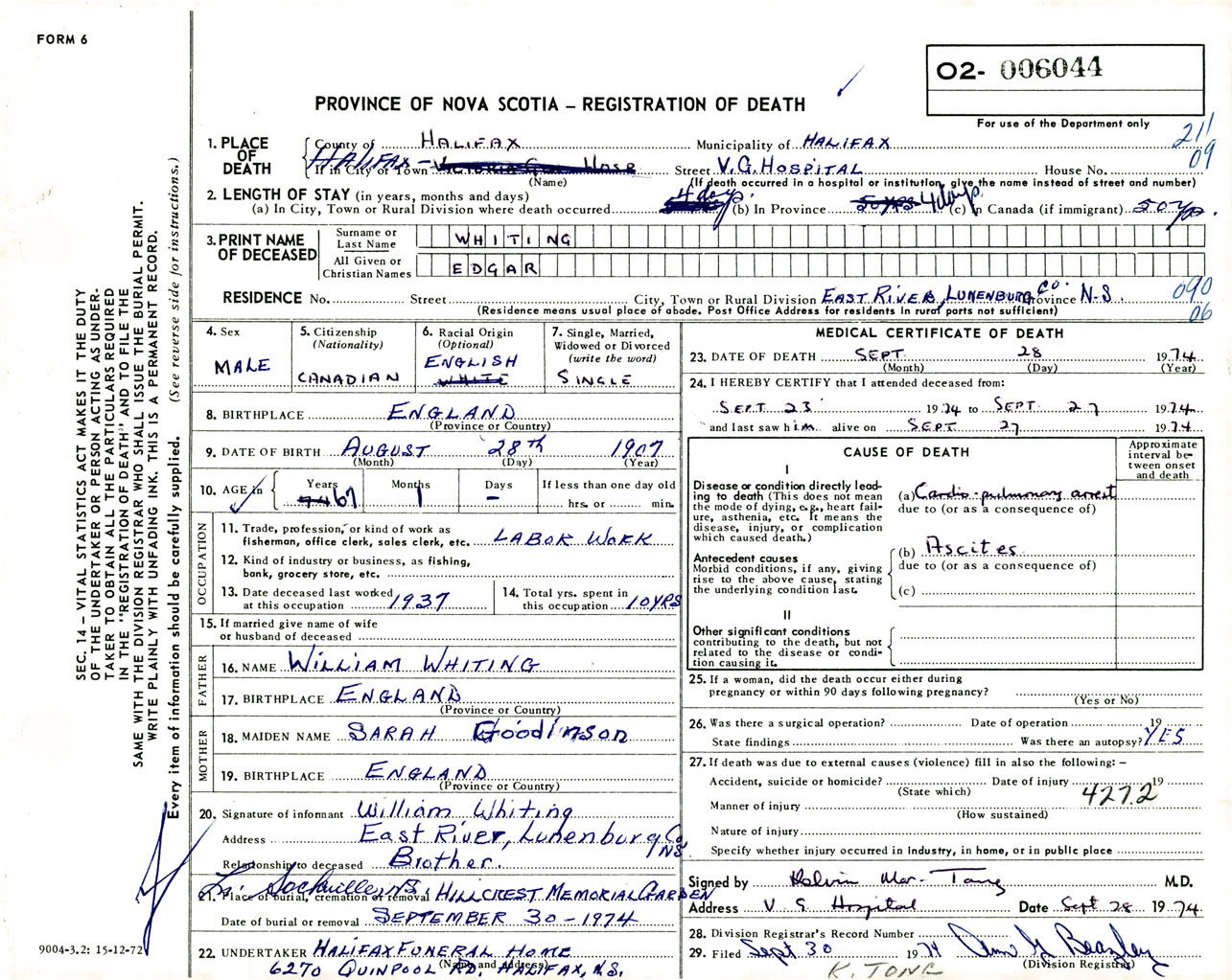 Male Death Registration: Year: 1974 number: 6044