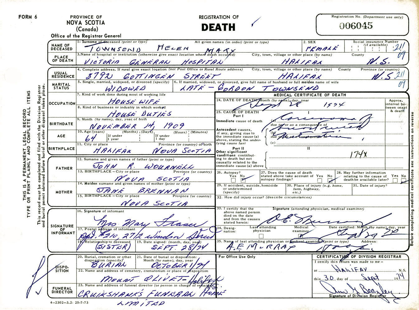 Female Death Registration: Year: 1974 number: 6045