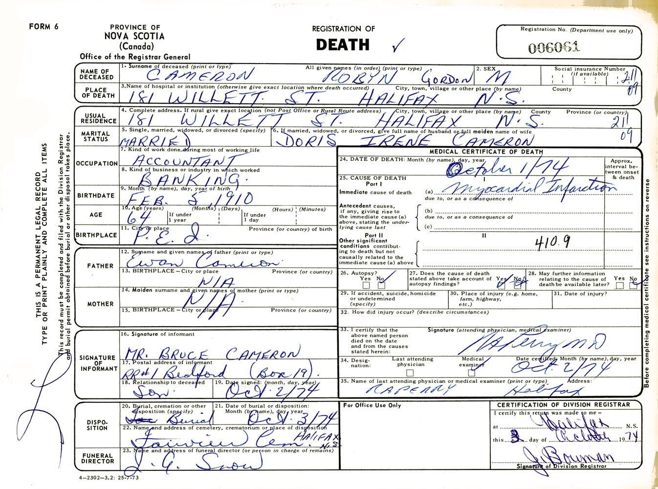 Male Death Registration: Year: 1974 number: 6061