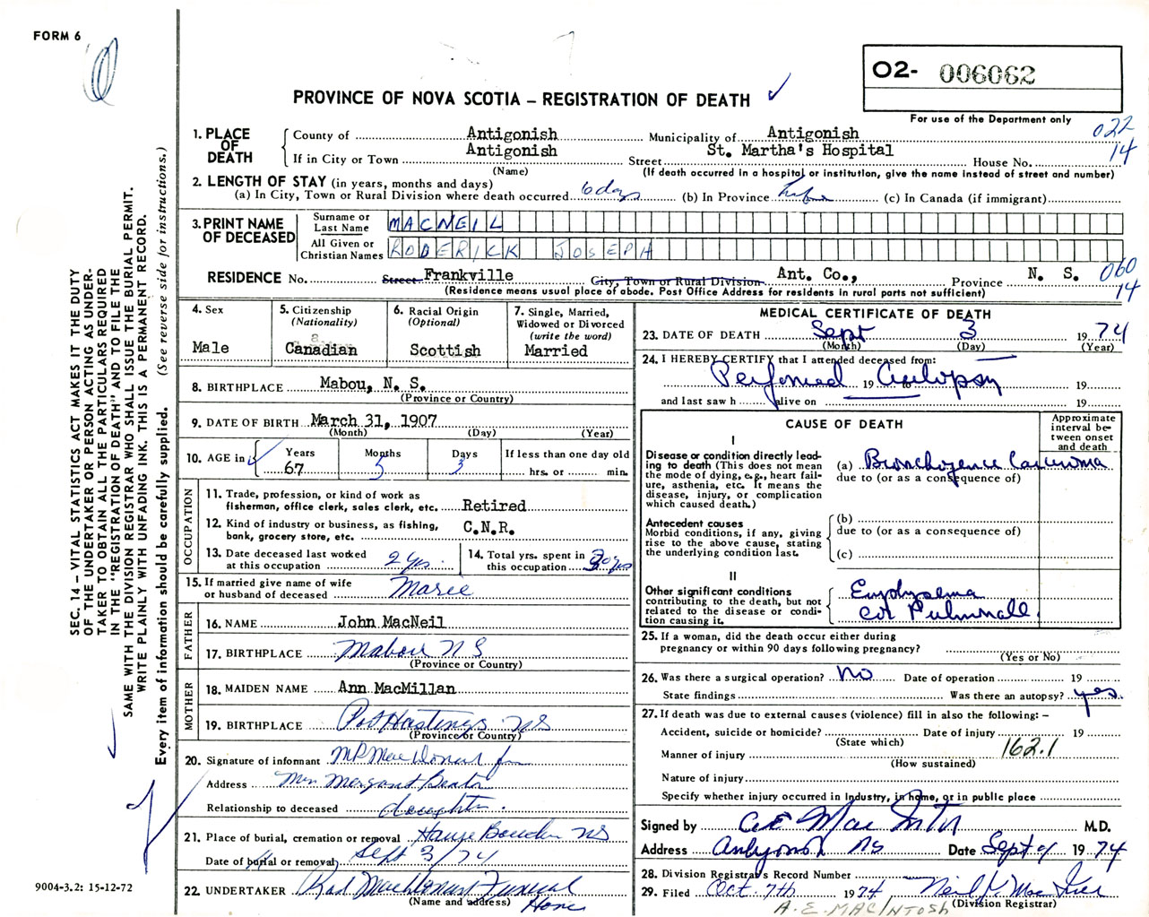Male Death Registration: Year: 1974 number: 6062