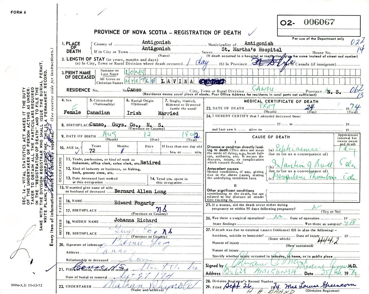 Female Death Registration: Year: 1974 number: 6067