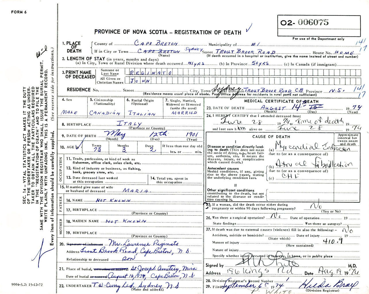 Male Death Registration: Year: 1974 number: 6075